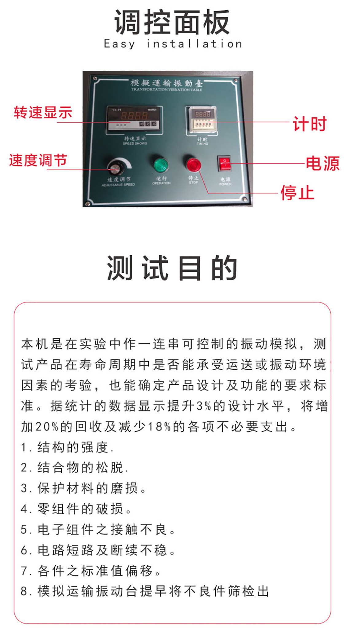 模擬運輸振動試驗臺適用于玩具、電子、家具、禮品、陶瓷、通訊、器材、計算機及汽車零件的震動試驗等,用來視察其耐運輸效果或耐久性均勻。數(shù)字儀表顯示振動頻率;同步靜噪皮帶傳動比;試品裝夾采用導軌式,操作方便、安全;機臺底座采用重型槽鋼配減振膠墊,安裝方便,運行平穩(wěn),無需安裝地腳螺絲;直流電機調(diào)速,運行平穩(wěn),負載能力強。
